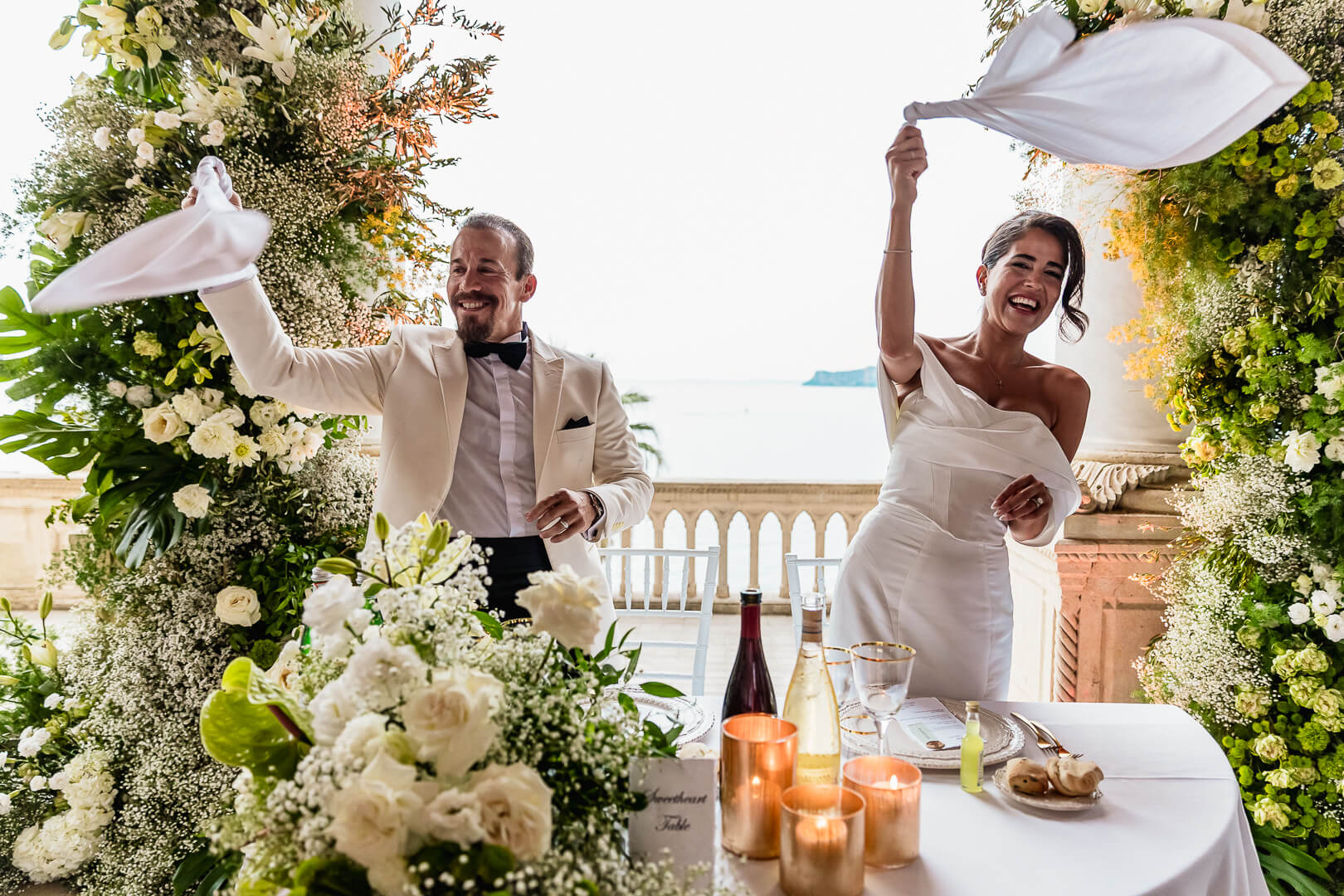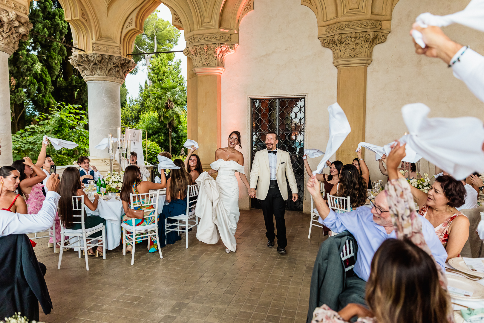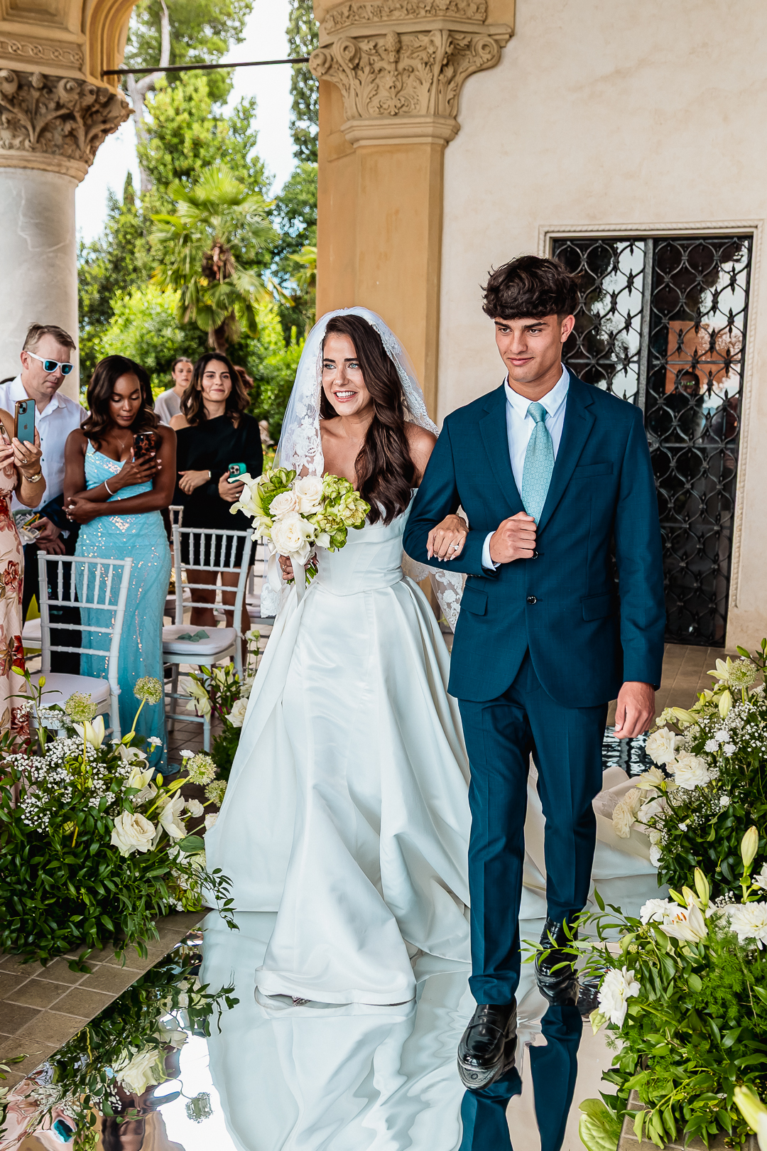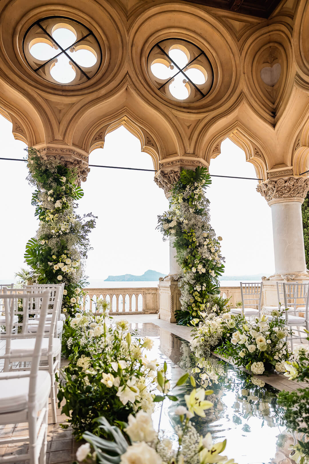 The ceremony was held in the island’s iconic loggia, where sweeping arches opened onto breathtaking views of the water. Millie arrived radiant in the late-afternoon light, while Gabriel waited beneath the golden tones of the architecture — a moment suspended between elegance and emotion. Surrounded by their closest family and friends, they exchanged personal vows that felt both intimate and timeless.