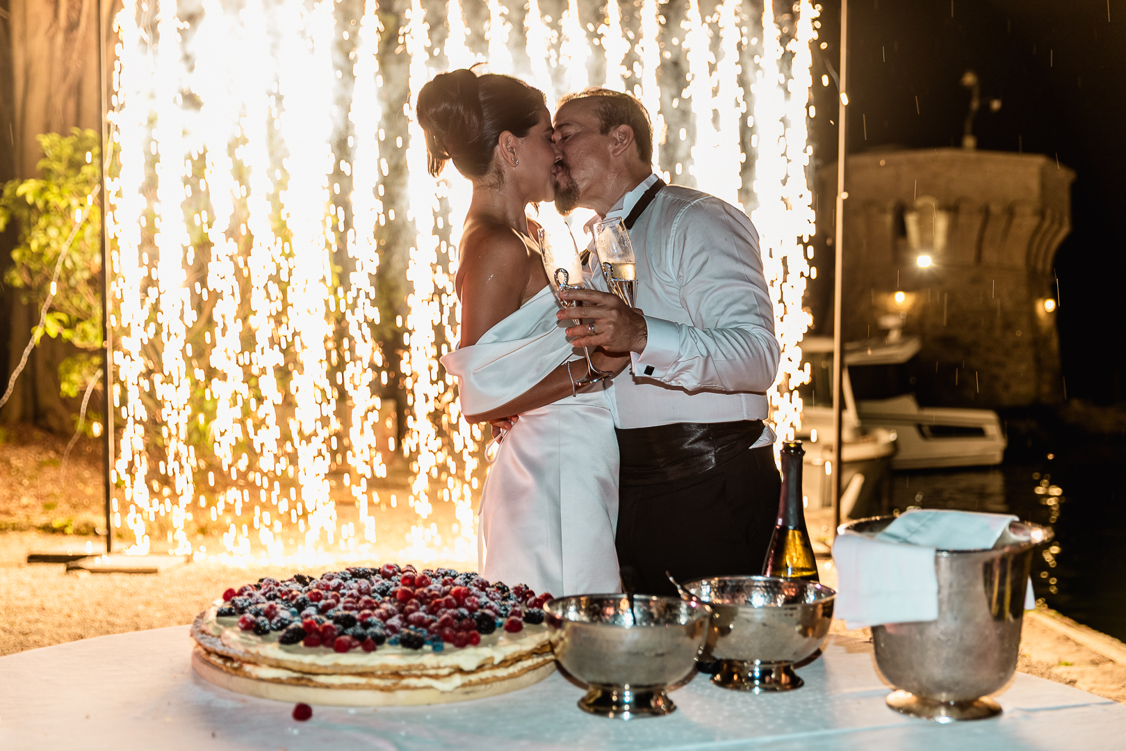 The celebration continued with an alfresco dinner overlooking the lake as the sun slowly descended. Soft candlelight, classic Italian touches, and the crisp evening air framed a reception filled with laughter, toasts, and the warmth of a family reunited from different parts of the world.